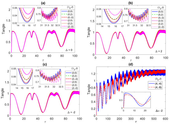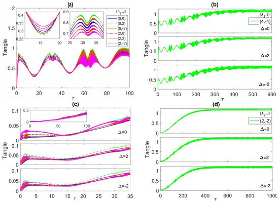 In Figure 10, we depict the dynamics of the system tangle starting from the maximally entangled correlated Bell state. As can be noticed, at all the different detuning values and , shown in panels (a), (b) and (c), respectively, the tangle starts at zero but rises abruptly to a value 1 within the same time period where the entanglement and the population have their initial rapid oscillations. Then, the tangle decreases reaching a minimum in the middle of a time period that coincides with the population collapse and ESD periods. It peaks up again reaching a maximum value that is higher than the previous one, with a local minimum, within a time period that coincides with the entanglement and population revival oscillation periods. This behavior continues afterward as shown in the different panels, where the maxima and minima values increase with time and get closer while the time periods are shrinking in a similar fashion to the entanglement and population inversion profiles. The inner insets in panel (a) show that for the curves coincide for as well as for (2, 0) and (2, 2), but they split at a non-zero detuning, as illustrated in the inner insets of panels (b) and (c). The asymptotic behavior of the tangle is presented in Figure 10d, at at two choices of the parameters; (4, ) (blue line) and (4, ) (red line). The tangle profile is oscillatory with a decreasing amplitude and increasing mean value that reach an approximately constant value asymptotically for both cases, which also agrees with the observed behavior of the entanglement and the population inversion. In fact, the other choices of the parameter values, at the different detuning values, show a similar asymptotic behavior, which we did not present here. In general, the different panels of Figure 10 demonstrate that the quantum correlation between the ensemble of the two atoms and the radiation field minimizes during the population collapse and the ESD periods and maximizes during their revivals, when the energy exchange between the atoms and the field takes place. The tangle dynamics starting from an initial W-state is illustrated in Figure 11a,b, where it shows a smaller oscillation amplitude compared with the Bell state case, at all detuning values but similarly it evolves to a quasi steady state asymptotically with an almost constant mean value. The detuning variation is not showing a noticeable effect on the tangle behavior in this case. In Figure 11c,d, the time evolution of the tangle starting from the separable initial state is explored. The tangle starts from zero as in the two previous cases but this time it shows a much weaker oscillatory variation with a smaller amplitude and a faster increasing mean value, which reaches a quasi-steady state asymptotically as well. The effect of the non-zero detuning is to shift the tangle values up and slightly split out the tangle lines at the different parameter choices from each other.