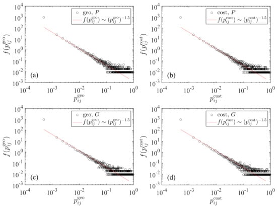 Power-law tailed distribution of the transportation probability between two cities. The solid lines are power laws with the same exponent of −1.5. (a) Population P is used in the raw radiation model with the geographic distance. (b) Population P is used in the cost-based radiation model with the driving distance. (c) Gross domestic product (GDP) G is used in the raw radiation model with the geographic distance. (d) Gross domestic product G is used in the cost-based radiation model with the driving distance.