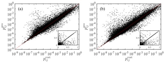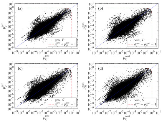 We illustrate in Figure 2 the asymmetric relationship between and for the two radiation models using population. The results for GDP is very similar for each model. It is striking that the predicted values of transportation probability span nine orders of magnitude. We also find that the scatter points lies close to the diagonal . The points from the cost-based model in Figure 2b concentrate more to the diagonal than the points in Figure 2a and thus the transportation probability matrix is less asymmetric. The two dashed lines impose a restriction on the transportation probability values, requiring that
