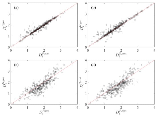 Comparison of the two transportation diversity measures and calculated using population P and gross domestic product G for the raw radiation model and the cost-based radiation model. (a) , and . (b) , and . (c) , , and . (d) , , and . The solid lines are the diagonal lines.