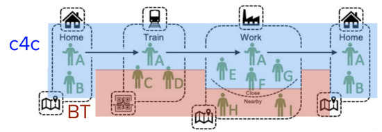 Integration of BT’s anonymous user tracking with a local broadcast application for close contacts (C4C). Image adapted from Ferreti et al. [13].