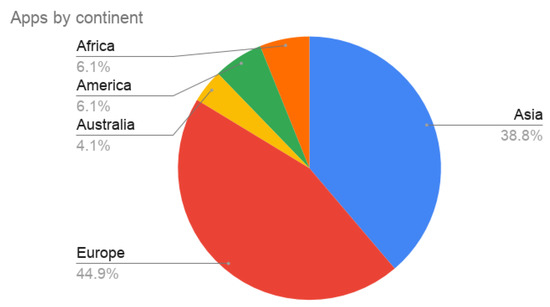 States have put their efforts into the development of mobile applications to track the spread of the SARS-Cov-2 over the population. The MIT Technology Review [15] has been collecting the different proposals. In the last checked update (28 February 2021), there are 49 registered apps. We have included in the studio the data from the application of the Spanish government, RadarCOVID (https://radarcovid.gob.es/, accessed on 17 May 2021), so we have analyzed 50 applications. Table 1 summarizes their characteristics. There are initiatives in the five continents, but most of the countries belong to Asia and Europe since they were the first places where COVID-19 appeared (Figure 2).