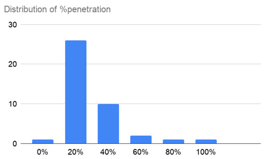 The population that uses the applications varies from 9000 inhabitants in Cyprus or Gibraltar to 163,000,000 in India. The median value is 970,000. Regarding the penetration, the average value is 16.9%, ranging from 0.3% in cases such as Malaysia, Bangladesh, or Hungary, to 91% in Qatar. However, the data are not Gaussian (see Figure 3). The median is 12.3%, and the median absolute deviation 14.8%, which gives a fitter view of the actual penetration.
