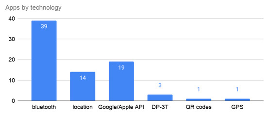 The Bluetooth technology is the solution that most countries have chosen (Figure 4), with 78% of the apps. Moreover, 38% of them use the Exposure Notification API provided by Google and Apple. Despite the recommendation to avoid location services, 28% of the apps use it.