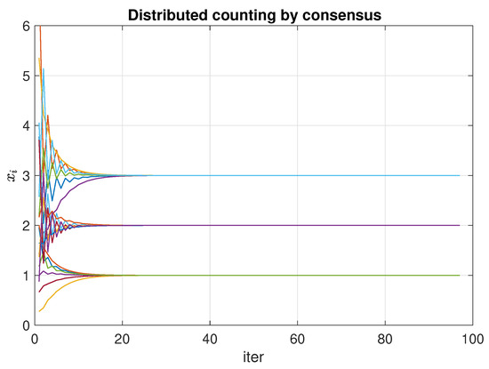 We can see in Figure 6 the evolution of the consensus process over each one of the components of the vector . The network converges to the total result , and applying Equation (5) each node obtains the total counting