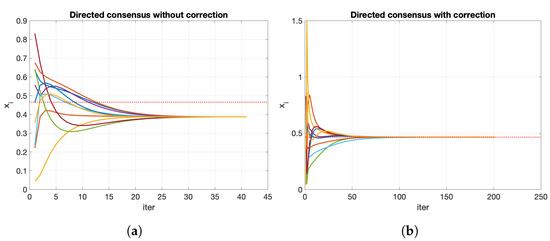 Figure 7a depicts the evolution of the consensus process over a directed network using the general formulation. The network converges to a common value (0.3876), which is different from the mean of the initial values (0.4660). Therefore, we need some mechanism to correct this deviation.