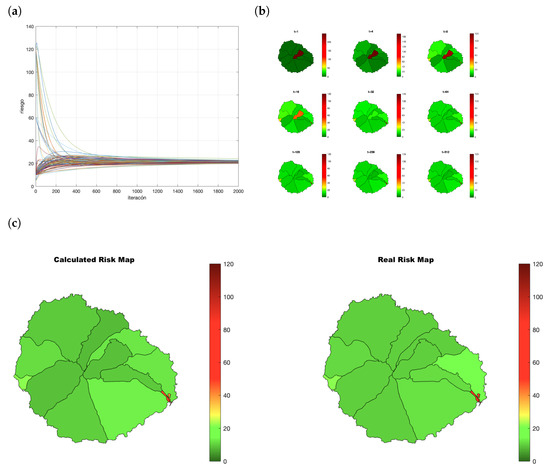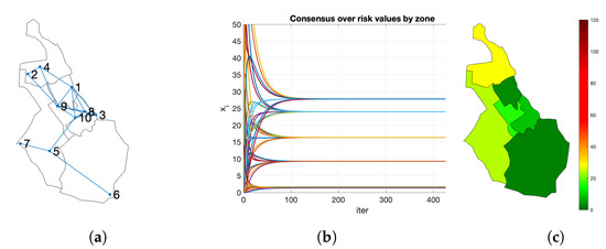 As an example, let us consider the situation after 30 days. Each node has a vector of 14 components, one for each census district . Let be the risk index of i and k the census district in which i lives. The first value starts with all components and for the census district of the node . Each node executes the process detailed in Algorithm 2. The evolution appears in Figure 13a and the resulting maps in Figure 13b. When the consensus process converges, the values obtained by the node are (see Table 3). The 3000 inhabitants have obtained similar values. R are the real risk values for each census district considering all the population. In this example, the districts with higher risk (7, 8, 9, and 11) are properly identified by the participants (Figure 13c).