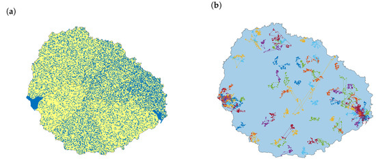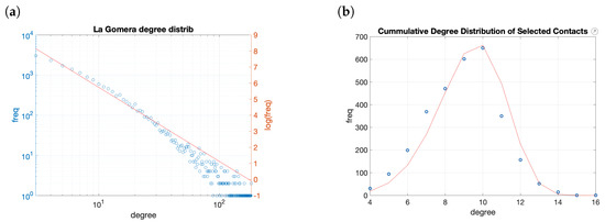 As in the case of the commuting trips, we have no direct data about the actual structure of the relationships in La Gomera. To simulate it, we have used previous works in which towns between 4000 and 70,000 were analyzed. We have assumed that the structure of the citizens’ relationships in Twitter is a reflex of the actual relations among all the people. We have analyzed the network formed by the Twitter account followers of the town halls of cities of similar sizes [27]. The cumulated degree distribution, in this case, follows a power law with parameter . Therefore, to model the entire population’s contact network, we have generated a preferential attachment network following the same distribution (Figure 12a). This generates a network of 58,000 contacts and a maximum degree of 876.