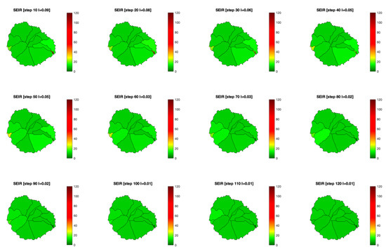 Evolution of the risk map with an SEIR model in La Gomera island, without considering any app. Color bar indicates the value of infected population (I).