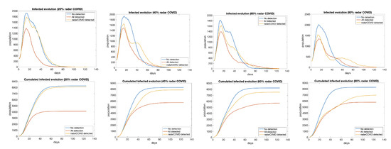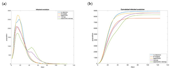 Evolution if the number of infections with different technological solutions was applied with 15% of penetration: (a) evolution; (b) cumulated.