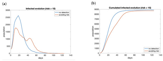 The effect of having a risk map available and avoid areas with high risk does not reduce the total number of infections significantly. It reduces the peak (see Figure 15a), but it keeps the propagation active for more days and the total number of cases at the end of the period is similar (Figure 15b). Therefore, we can conclude that the use of a risk map does not reduce the number of infected people in the long run. Nevertheless, the effect is a reduction in the peak, smoothing the curve of infections. The main benefit of this situation is to avoid the collapse of health services if the cases are reduced enough. We do not have available the information to check that hypothesis.