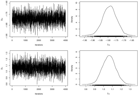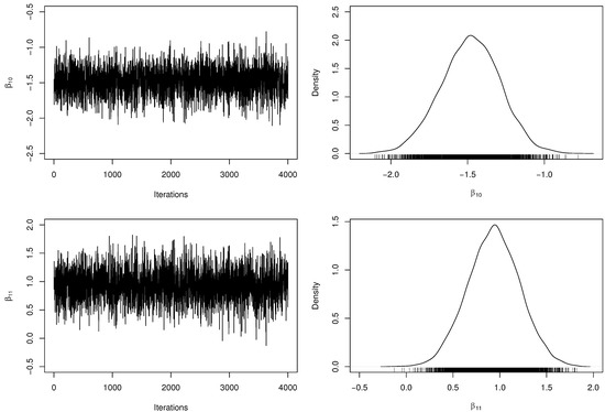 Table 3 presents the posterior parameter estimates and 95% HPDIs from fitted model. When obtaining the MCMC samples, the acceptance rate in the RwM algorithm was approximately . Besides, we have computed the number of effectively pseudo-independent draws, that is, the Effective Sample Size (ESS) for each parameter. Figure 2 and Figure 3 depict the chains’ history (trace plots) and the marginal posterior distributions of the regression coefficients. The normality assumption of the generated chains is quite reasonable, even with slight tails on the estimated densities. Additionally, there exists evidence of symmetry since the posterior means and medians are very close to each other. For each parameter, the ESS was estimated at approximately half of M, indicating a good mixing of the generated chains without computational waste.