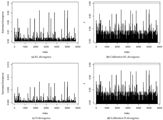 A sensitivity analysis to verify the existence of influential points is presented in Figure 4. We have estimated all divergence measures presented in Table A1 but, since the obtained results led to the same conclusions, we are only reporting the KL and H divergences and their calibration for each observation. Even being very conservative by considering an observation whose distance has a calibration exceeding as an influential point, we do not have found evidence that any observation has influenced the estimation of any coefficient of the regression model significantly.
