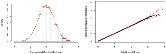 For obvious reasons, we focus on the definition of RQRs for discrete random variables. In this case, the RQR associated with the i-th observation is defined as , where denotes the cdf of the standard normal distribution and is a Uniform random variable defined on , with and , where is the cdf of the current model. In our case, we may obtain an MC estimator for the RQR as , with . Here, is an estimate for the probability of using cdf (4), where and depend on the fitted model as and .