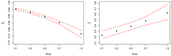 According to [32], when considering higher linear energy transfer radiations, the incidence of chromosomal aberrations becomes a linear function of the dose because the more densely ionizing nature of the radiation leads to an “one track” distribution of damage. Such an aspect can be seen in the right-panel of Figure 1, which highlights the linear behavior between the average number of aberrations and the doses. In this way, our assumption is that , where parameters and are specified as linear dose models, that is,