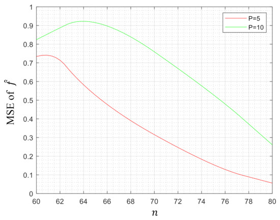 To demonstrate the efficiency of our method, in this section, we evaluated our model on some synthetic datasets. The data in with dimension and were generated randomly according to the uniform distribution on the interval . Then, we computed the MSE of our estimator . Figure 1, Figure 2 and Figure 3 depict the MSE of when the parameter pair and , respectively, while the number of samples n varies from 50/60 to 80/90. This paper used Yalmip [43] modeling in the MATLAB environment and called fmincon to solve the problem. From the figures, we can notice that the MSEs tended to decrease with the increase of the number of samples n under three kinds of parameter settings, which verified that our method was effective in the regression of high-dimensional data.