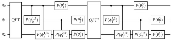 The map (2) can be efficiently simulated on a quantum computer. The quantum algorithm simulating the sawtooth map dynamics is based on the forward/backward quantum Fourier transform between action (momentum) and angle bases. Such an approach is convenient since the operator U, introduced in Equation (2), is the product of two operators, and , diagonal in the and I representations, respectively. This quantum algorithm requires the following steps for one map iteration: