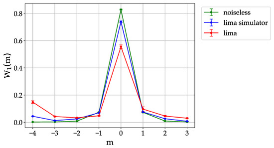 As we can see in Figure 2, the quantum hardware exhibits a localization peak after a single map step. On the other hand, the height of the peak, , is significantly smaller than the noiseless value, , and the prediction of the Qiskit simulator, . These results show that the Qiskit simulator may at least underestimate some of the relevant noise channels. It is also interesting to remark that, while the ideal distribution is symmetric around its peak, the noisy ones are markedly asymmetric. We interpret this asymmetry as a consequence of the binary coding of momentum eigenstates. For instance, a noise channel leading to a flipping of the most significant qubit would induce a probability transfer from the peak (, corresponding to the state of the three qubits) to the state (corresponding to ).