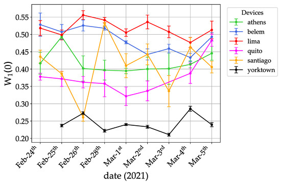 Height of the localization peak after one map step for several quantum processors. Data taken from 24th February to 5th March 2021.