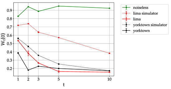 Finally, with the aim of further testing the capabilities of quantum processors to simulate dynamical localization, we show in Figure 5 the localization peak value as a function of the number of kicks. For the noiseless case the distribution remains localized with fluctuations of around 0.9. For the ibmqx2 - yorktown quantum processor the peak at does not emerge from noise already at . On the other hand, for the lima quantum processor the peak is visible up to kicks. Evidently, the Qiskit simulator underestimates the level of noise in the corresponding devices, and predicts a peak decay in 3–5 map steps (for ibmx2-yorktown) and in 10–15 kicks for lima. Overall, the data of Figure 3 and Figure 5 testify the significant improvement of quantum hardware performance in the last few years. As a closing remark, it is worth reminding that error mitigation techniques can be applied to reduce the impact of various sources of noise on near term quantum processors [30,31,32]. We have applied an error mitigation procedure based on Ref. [31] in combination with the Qiskit noise model, and only found a limited effect in improving the specific quantum localization algorithm (results not shown). A more detailed characterization of noise in such devices is by itself an interesting problem, which goes, however, beyond the scope of the present work.