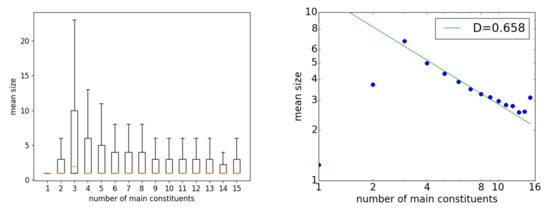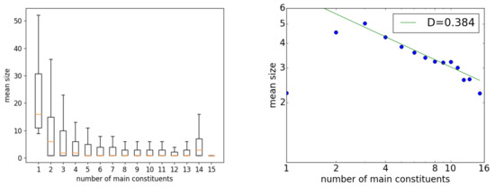 The data points for did not follow the Menzerath property, but for , the data did tend to follow it. The y values appeared to start fluctuating at around , which is natural because sentences with more than 10 main constituents are rarer than sentences with fewer main constituents. In the right graph, the points between are aligned relatively straight, and the fit to a power function gave .