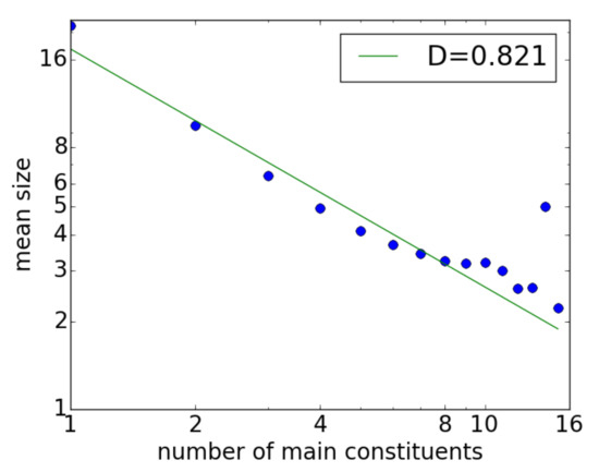 Given that the theory was confirmed and was reproduced, the next issue is to find a condition to reproduce the Menzerath property. One way is simply by filtering out shorter sentences of length less than . Any threshold would have the same effect, but following the previous section’s evidence that represents some limit, the results for are shown on the right side of Figure 5. Here, as the points almost showed monotonic decay starting from up to , the fitting to the power function was performed between . The resulting graph shows that the Menzerath property held with . The average statistics for this case of are listed in the last row of Table 1. With increasing , D would increase gradually and could take any arbitrary value, even above 1.0.