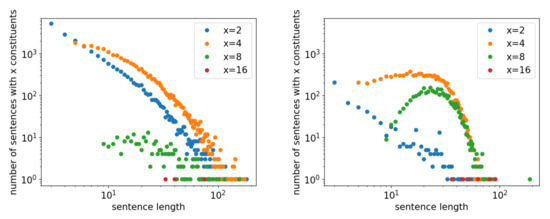 Following previous works [21,22,23,24], in this work, too, the main predicates of sentences were used to acquire statistics; y is the mean size of the constituents modifying the main predicate and x is the number of modifiers of the main predicate.