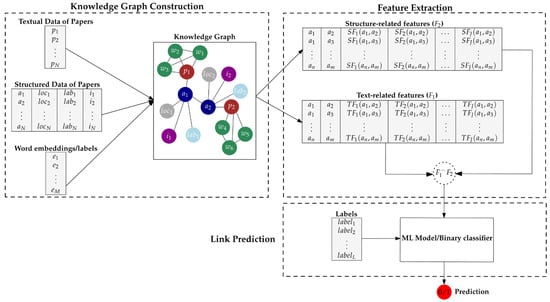 The development of knowledge graph-based approaches for predicting future research collaborations has received increasing attention in recent years [,]. In these approaches, a scientific article that has been written by two researchers denotes implicitly a collaboration between them []. In general, the majority of the existing knowledge graph based approaches builds on concepts and methods from graph theory to infer knowledge that is not explicitly provided, exploiting the structural characteristics of the corresponding research graph []. However, these approaches ignore the extremely useful (but unstructured) textual data that are in most cases available in documents such as scientific articles and reports []; as a consequence, they are not able to meaningfully incorporate both structural and textual information into their knowledge graph.