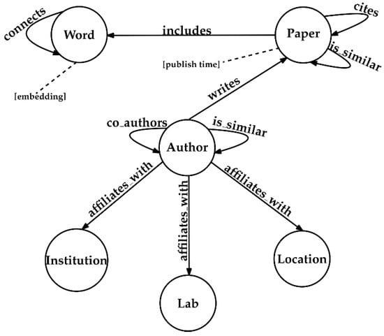 The nature of knowledge graphs enables the co-existence of multiple types of entities and relationships in the same data schema. Specifically, our scientific knowledge graph includes entity nodes with types such as ‘Paper’, ‘Author’, ‘Laboratory’, ‘Location’, ‘Institution’ and ‘Word’, as well as types of relationship edges such as ‘is_similar’, ‘cites’, ‘writes’, ‘includes’, ‘connects’, ‘co_authors’ and ‘affiliates_with’ (see Figure 2).