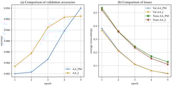 (a) Comparison of validation accuracies of the NN model using the AA_PM and the AA_J feature combinations; (b) Comparison of cross-entropy of the NN model using the AA_PM and the AA_J feature combinations.
