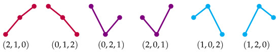 The number of permutations in is given by . In order to get a better intuitive understanding of the concept of ordinal patterns, we have a closer look at the following example, before turning to the formal definition.