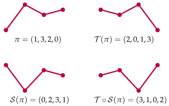 One fundamental property of ordinal patterns is that they are uniquely determined by the increments of the considered time series. As one can imagine in Example 1, the knowledge of the increments between the data points is sufficient to obtain the corresponding ordinal pattern. In mathematical terms, we can define another mapping , which assigns the corresponding ordinal pattern to each vector of increments, as can be seen in [5], p. 1783.
