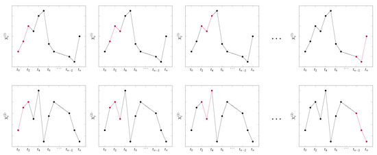 Figure 1 provides an illustrative understanding of the extraction of an ordinal pattern from a data set. The data points of interest are colored in red and we consider a pattern of length , which means that we have to take data points into consideration. We fix the points in time , , and and extract the data points from the time series. Then, we search for the point in time which exhibits the largest value in the resulting data and write down the corresponding time index. In this example, it was given by . We order the data points by writing the time position of the largest value as the first entry, the time position of the second largest as the second entry, etc. Hence, the absolute values are ordered from largest to smallest and the ordinal pattern is obtained for the considered data points.