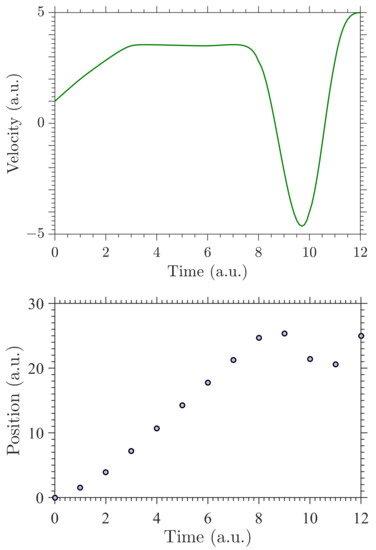 The starting and ending values of in Equation (7) are the initial and the last positions recorded. Here, is the spline in interval. We point out that the exponential cubic spline is analytically integrable and its technical details are given in Appendix A. When a relationship (as in (1) and (7)) is used to match an unknown quantity (gradient/velocity) and the observable data (position), the relationship should be able to generate data as close as possible to the observable information if the desired/unknown quantity is known. This is called the forward problem in Bayesian language. However, what is required here in our study is to be able to solve the inverse problem. That is, making inferences about the desired/unknown quantity using the observed information and the functional form of the unknown (here, the exponential cubic spline) [30,31,32]. An example of solving a forward problem by computing positions when the velocity is known is shown in Figure 1.