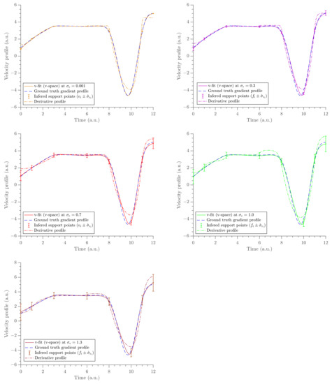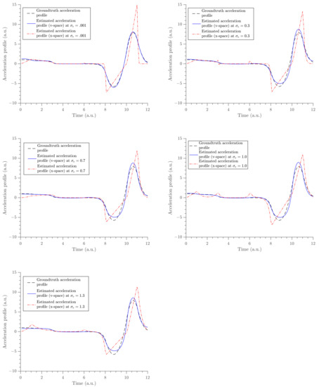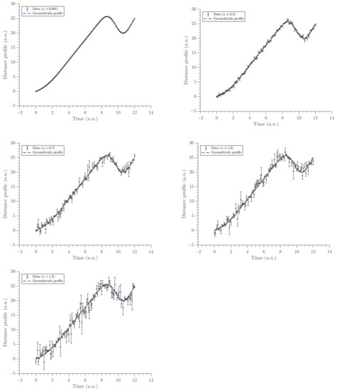 This section presents the results obtained from the methodology built throughout the previous sections. The sensitivity of gradient estimates at different noise levels (of the position data) were tested. The noise levels (denoted by ) on x-space are depicted in Figure 2 with five different noise levels: . The noise levels were selected so that they cover almost all possibilities of the standard Gaussian noise. That is, by the definition of the Gaussian distribution, the first four noise levels cover a probability of and the last noise level covers a probability of .