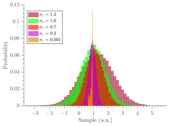 where the quantity is the -dimensional mean vector and is a -dimensional covariance matrix of the noise. We further assume and the noise is uncorrelated which, in turn, makes a diagonal matrix with diagonal elements, . Omitting the arrow notation for vectorial quantities, we can write the following: