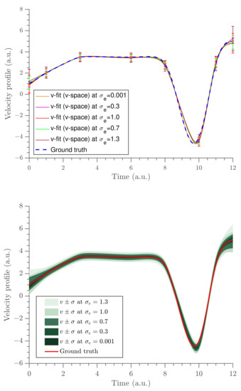 where and represent the object’s position and velocity, respectively. By the use of our notations, lives in x-space and lives in v-space. In our approach, a functional form (mathematical model) is given to velocity, rather than to measured data as in the traditional approach. Therefore, our mapping is such that the positions in x-space are ’obtained’ by integrating the functional form placed in v-space. The Bayes’ theorem allows us to do this as an inference problem to infer the unknowns of the functional form in v-space with the information available in x-space.