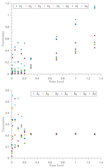 The relationship between uncertainty of the estimates and the noise level of the system. The top panel depicts the relationship of velocity parameters (here, indicates ), whereas the bottom panel shows the relationship of tension parameters (here, indicates ). Note that additional noise levels are included to demonstrate how the uncertainty in the estimated lambda converges to the Gaussian prior uncertainty when the data noise exceeds the prior uncertainty.