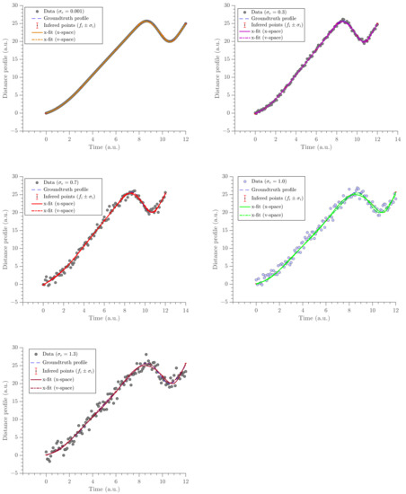 The calculated SSE with true data and noisy data are shown in the Table 4. The SSE values for noisy data are smaller for the x-fit (x-space). This, in turn, reflects the fact that the x-fit (x-space) better follows noisy data. However, the SSE values for true data are smaller for the x-fit (v-space). This, instead, reflects the fact that the x-fit (v-space) better follows true data.