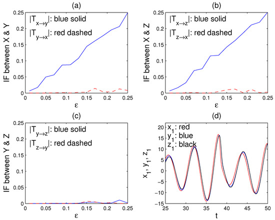 The information flows among the oscillators X, Y, and Z (in nats/unit time) versus the coupling strength : (a) (blue) and (red); (b) (blue) and (red); (c) (blue) and (red). (d) The series of , , and on a time interval when the coupling parameter . (Note, in solving for , the initial conditions are randomly chosen, some of which may happen to make a highly singular matrix and hence cause large errors. In that case, simply re-run the program.)