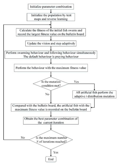 Therefore, the position of artificial fish to perform the adaptive t distribution mutation is calculated in Equation (9).