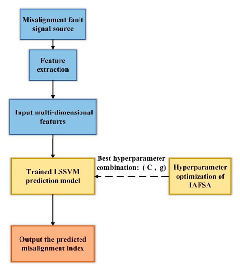 The prediction accuracy is one of the most important indicators of the prediction model. Because the LSSVM model contains two hyperparameters which are the penalty factor C and kernel parameter g. If the selection of these two parameters is inappropriate, it will cause a decrease in prediction accuracy and an increase in the false alarm rate. Manual adjustment of parameters does not have a certain theoretical basis, which consumes a lot of time. Therefore, the improved AFSA (IAFSA) is used to optimize the hyperparameters of LSSVM, and the root mean square error (RMSE) between the predicted value and the true value is used as the objective function to obtain the optimal hyperparameter combination of LSSVM. Based on the multi-dimensional features of misalignment signal, the LSSVM optimized by IAFSA can predict the future development trend of the misalignment index. The flow chart of the LSSVM model optimized by IAFSA is shown in Figure 3.