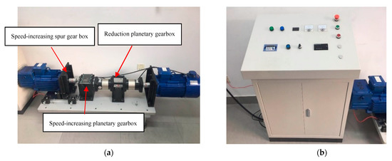 The prediction data of misalignment fault is collected from the test bench which is mainly composed of the electric motor (active motor), transmission system, generator (passive motor), and control cabinet, as is shown in Figure 4. The model of active motor is YP2-112M-6, which is the variable-frequency variable-speed three-phase asynchronous motor. The rated power is 2.2 kW, the rated voltage is 380 V, the rated current is 5.6 A, the maximum speed is 940 r/min, and the number of poles is 6. The rotation speed of the motor is first reduced by the planetary gearbox with a transmission ratio of 1:50 in order to correspond to the rotation speed of the wind wheel. To simulates the operation of wind turbines, the rotation speed is then increased by the planetary gearbox with a transmission ratio of 40:1 and the spur gear box with a transmission ratio of 1.5:1. The generator is transformed from YZR112M-6-1.5 kW, the rated power is 1.5 kW, the maximum speed is 1000 r/min, and the number of poles is 6. The generator, motor, gearbox, and other components are fixed on the base table, which is convenient for setting misalignment fault. The speed of the motor can be set on the control cabinet. Besides, the control cabinet is equipped with a start–stop button and a running indicator to ensure the safe operation of the test bench.