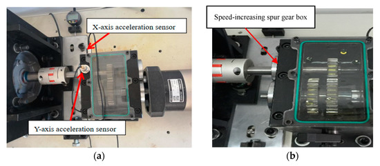 The position of the acceleration sensor. (a) the vibration signal collection; (b) the spur gear box.