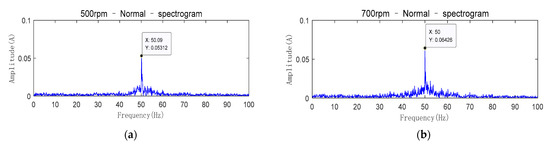 As the motor speed is 500 rpm, the speed transmitted to the generator rotor shaft is 600 rpm after 1.2 times the total transmission ratio. According to the mathematical conversion between speed n and frequency : , it can be concluded that the rotating frequency of the generator rotor shaft is 10 Hz. Theoretically, when the misalignment fault occurs, there will be multiple frequency multipliers such as fundamental frequency 10 Hz, the second harmonic 20 Hz and the third harmonic 30 Hz in the spectrum [27].