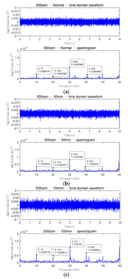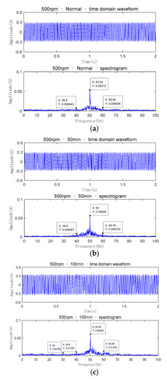 In the experiment, for the collection of signals, the rotation speed of the motor is set to 500 rpm and the sampling interval is 5 min. The sampling time of the vibration signal is 10 s and the sampling frequency of acceleration sensor is 1 kHz. The sampling time of the current signal is 2 s and the sampling frequency of the current signal is 2 kHz. During the experiment, a slight misalignment fault occurred between the output shaft of the gearbox and the rotor shaft of the generator by adjusting the position of the generator. At the same time, 60 samples of vibration and current signals under misalignment fault are collected. The time-domain waveform and spectrogram of vibration signals and current signals collected by the experimental platform at different running times are shown in Figure 8 and Figure 9, respectively.