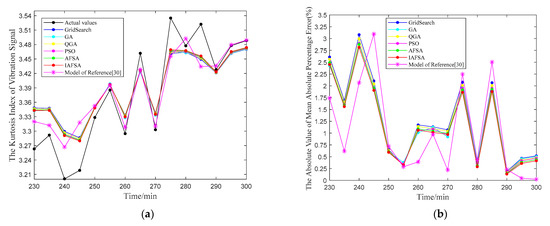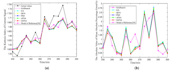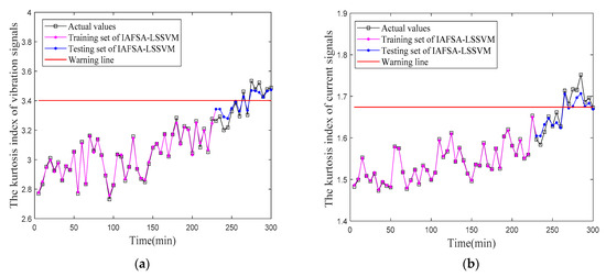 Figure 13 shows the experimental process in which the misalignment faults continue to increase. It can be seen from Figure 13 that the predicted kurtosis index obtained from the training set and testing set of LSSVM optimized by IAFSA is basically close to the actual values of vibration and current signals. In Figure 13, the kurtosis index of vibration and current signals increases with the rise of the operation time of the test bench, which indicates that the fault degree of misalignment also grows up with the increase in running time. Before 265 min, although the kurtosis index of vibration and current signals has a certain increase trend, it does not exceed the warning line. This is mainly because the fault degree of misalignment is minor at the beginning of the test bench, which is not sufficient for having a large impact on the normal operation. Therefore, the kurtosis index does not exceed the warning line. At 265 min, the kurtosis index of vibration and current signals has exceeded the warning line, and most of the kurtosis index values are higher than the warning line after 265 min. It can be known from the principle that the kurtosis index of vibration and current signals at 265 min no longer belongs to the fluctuation range of the kurtosis index during the normal operation of equipment, but belongs to abnormal data. This indicates that the fault degree of misalignment has exceeded the acceptable range of normal operation. Therefore, when the test bench runs to 265 min, it should be shut down in time to prevent the damage of equipment due to the continued deterioration of misalignment faults, so as to achieve the early warning.