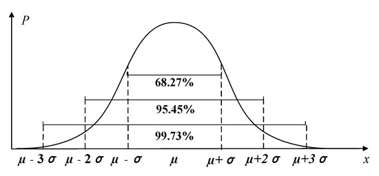 Assuming that the random variable follows the normal distribution. The average value of is and the standard deviation is . From the principle, the probability of data falls within the range is . The probability of data falls within the range is . The probability of data falls within the range is [35], as shown in Figure 12. According to the characteristics of the normal distribution, when the equipment is in a normal state, the probability of the kurtosis index falls within the range is . When the fault occurs, the distribution of fault signals gradually deviates from the normal distribution. Meanwhile, the value of the kurtosis index obtained from signals will exceed the range , belonging to abnormal data. Thus, and calculated from the kurtosis index are taken as the upper and lower limits of misalignment fault warning. If the kurtosis index obtained from collected signals is within , it represents that the equipment is still in normal operation. If the kurtosis index is outside the range , it demonstrates that the equipment is in an abnormal state, which achieves the misalignment fault warning.