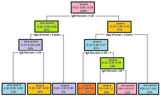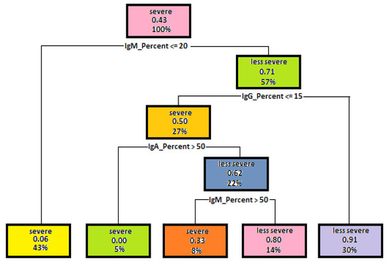 When analyzing the above-mentioned tree it can be observed that a lower immunoglobulin level in a patient may result in a severe mutation. The immunoglobulin M level was the first parameter under analysis, which was used for splitting. At the undetectable level of IgM (43%), already in the first step of tree generation, the observations were attributed to severe mutations. Only one of them was misclassified. In the next step, the immunoglobulin G level was a decision attribute. Thirty percent of observations with a level higher than an undetectable one were attributed to a group of less severe mutations. In this step, only one observation was misclassified as well. The immunoglobulin A level is a third decision-making attribute. One hundred percent of observations with reduced IgA level and compliance with previous conditions were attributed to severe mutations. While respecting all the above-mentioned rules and lowering the IgM level, 8% of the observations were attributed to severe mutations, the others to less severe ones. There was one misclassified observation in each leaf node.
