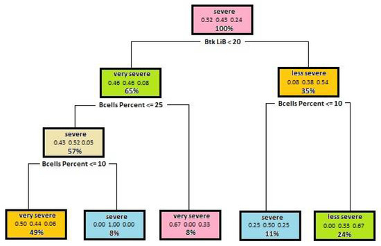The built model shows quite a good result. The aforementioned tree shows that disease severity depends on B lymphocytes as well. A low level of Btk expression and the absence or very low level of B lymphocytes in patients’ blood may result in a severe course of Bruton’s disease. On the other hand, a higher Btk expression of B lymphocytes and a higher level of B cells in blood indicates less severe disease course.